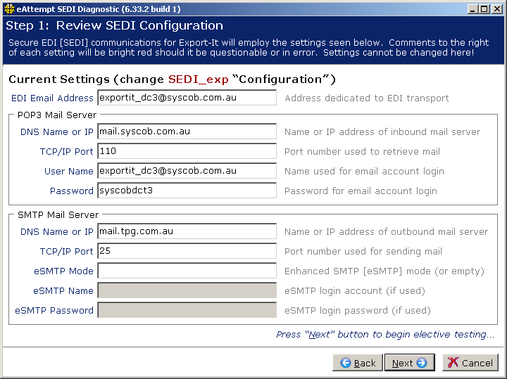 Note that the first column is a timestamp, in “HHMMSS.ZZZ” format with decimal precision to the millisecond, which is useful for detecting timeout situations or delays (in common with the SEDI processors log formats). After the access tests press the Next button to test the actual inbound and outbound email processors used by SEDI.