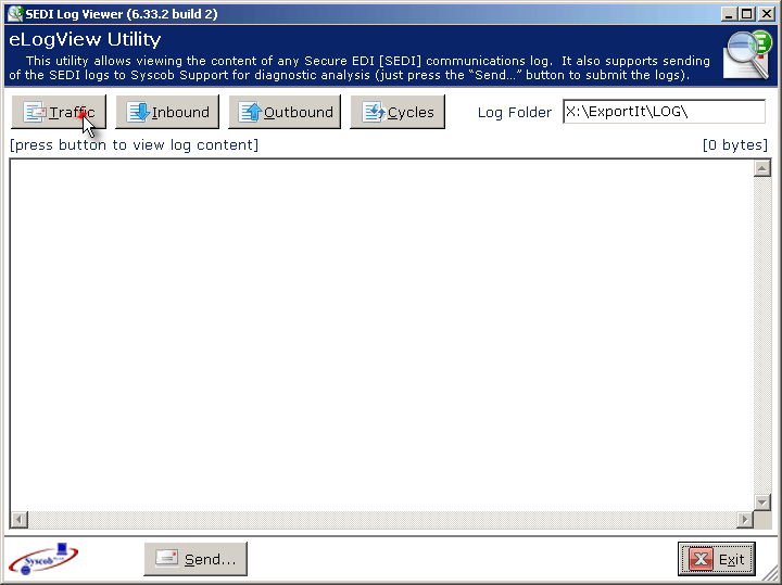 If there is not a mix of outbound and inbound traffic, or there is nothing recent in the log (the capture above illustrates how to interpret the date and time of a message), then send the logs to Syscob Support for analysis. To do that simply press the Send… button at the bottom as in this example: