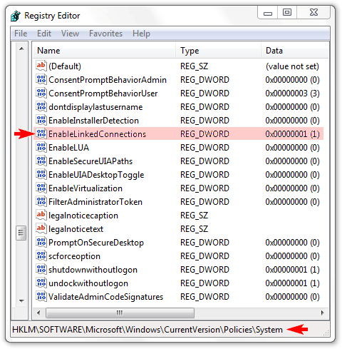 If the EnableLinkedConnections value is zero then it needs to be modified to have the value 0x00000001 (as seen above). If the critical value does not exist (i.e. there is no value named EnableLinkedConnections) in this key then the KnowledgeBase article provides these instructions for defining one: